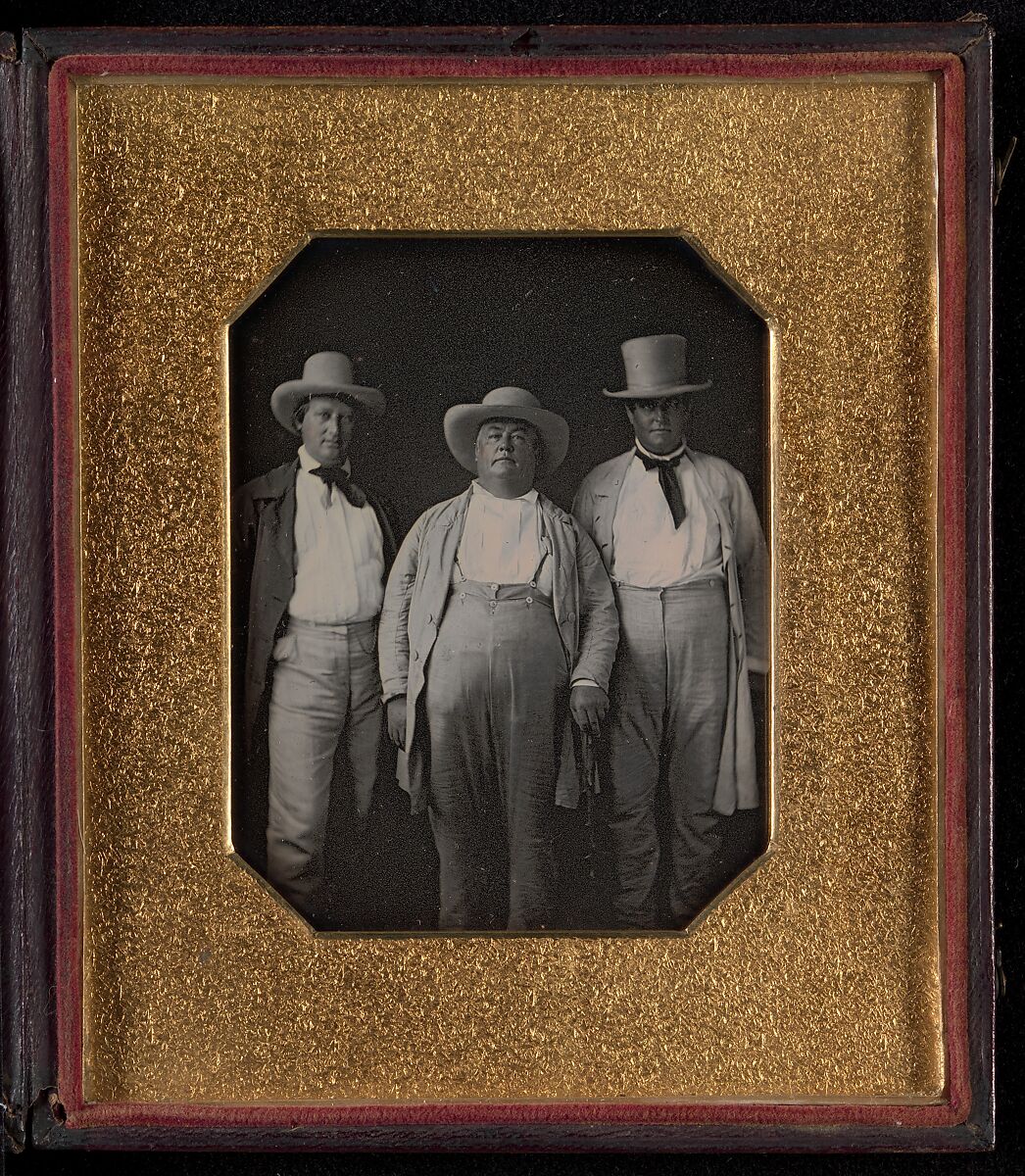 This portrait of three men–likely Southern planters, based on their clothing–is an exquisite example of the unparalleled pictorial resolution and illusory three-dimensionality of the finest daguerreotypes. Upon close inspection, one can distinguish the older man’s fine straw hat from the felt headgear worn by his associates. So, too, his suit of striped cotton with fabric-covered buttons differs from the linen clothing worn by the younger men. Their button-fly pants date the picture to after 1845, when this style was introduced to America despite the protests of the religious community, who saw the flap as a license to sin.