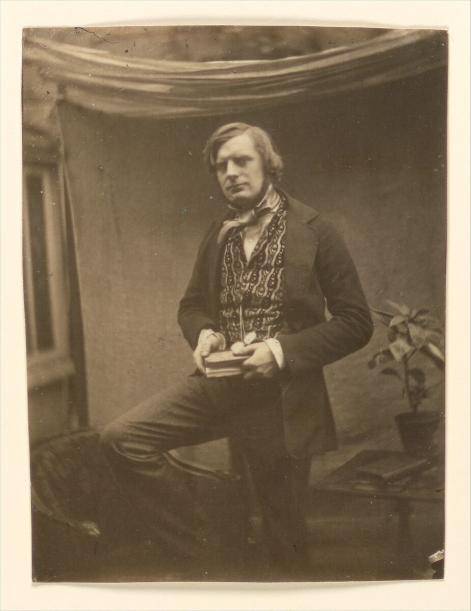 In an improvised studio with overhead drapery to control the light, the thirty-two-year-old Fenton struck a jaunty pose for this self-portrait. Perhaps timing the exposure, he set his open pocket watch on the book in his hands. This is among Fenton's earliest photographs.
