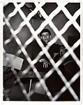 The subject of this photograph, a sixteen-year-old boy, confessed to tying up and strangling four-year-old William Drach in the Bronx on October 29, 1944, allegedly mimicking what he had seen in a movie. Here, Weegee adapts the traditional tropes of portraiture, in which the sitter’s hands and facial features are of the utmost importance, to present a caged criminal still armed with his weapons. Exploiting the cramped quarters of the police van, Weegee frames the boy’s placid face within the crisscross of the chain-linked fence. The boy’s hands—the presumed tools of his crime—are eerily dismembered from his body.