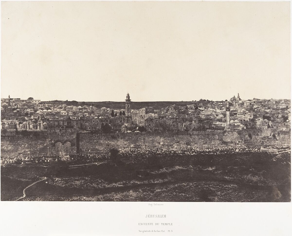 This is one portion of a three-part panorama that forms an all-encompassing view from outside Jerusalem’s walls. It displays the city’s architectural diversity, including domed mosques and churches, ancient masonry, and towering minarets. Although other photographic views of Jerusalem had been produced by Maxime Du Camp and Joseph-Philibert Girault de Prangey, Salzmann’s project was the most thorough and ambitious to date. Before its integration into the 1856 album, this panorama was offered separately in 1854. A review in the prominent Paris bulletin Annales Archéologiques suggested that the photographs forged a spiritual relationship with the sacred city: "We have here living Jerusalem. . . . An identical panorama should be exposed in all the churches and in all the seminaries, under the eyes of the young people who are destined for the priesthood; there is no description that inspires thoughts more numerous or more profound."