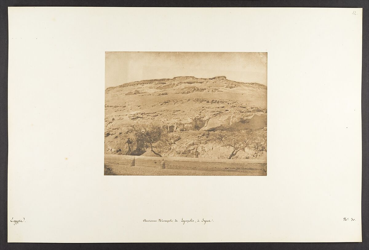 Maxime Du Camp's mission to Egypt and the Near East in 1849-51 to make a photographic survey of monuments and sites is well documented in his writings and in those of his fellow traveler, Gustave Flaubert. After an initial stay in Cairo, the two friends hired a boat to take them up the Nile as far as the second cataract, after which they descended the river at leisure, exploring the archaeological sites along its banks. In July 1850 they left Egypt for Palestine, Turkey, and Greece before they parted in Italy the following April. Du Camp's album "Egypte, Nubie, Palestine et Syrie," published in 1852 and containing 125 photographs printed by Blanquart-Evrard, brought its author instant fame. In addition to the published edition, Du Camp arranged for a private printing of a few portfolios, such as the one in the Gilman collection, which numbers 174 images particularly noteworthy for their warm color and luminescence. Possibly printed in Gustave Le Gray's studio, the present portfolio is