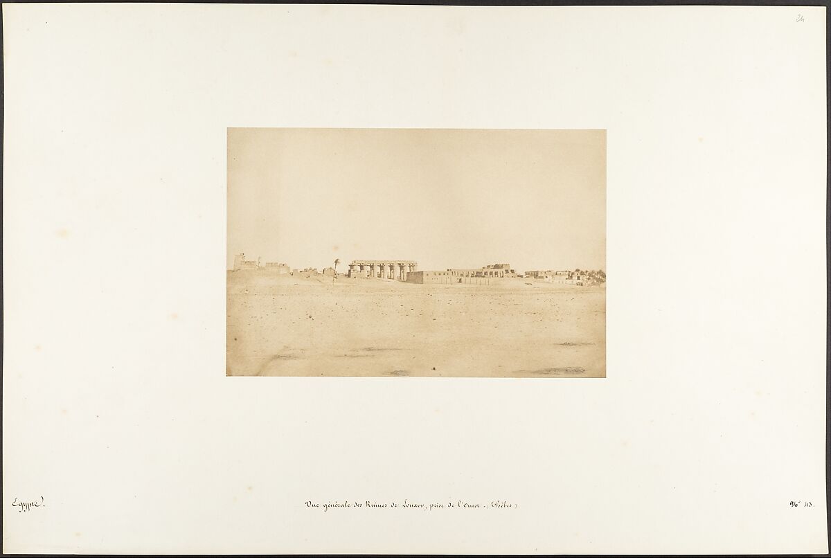Maxime Du Camp's mission to Egypt and the Near East in 1849-51 to make a photographic survey of monuments and sites is well documented in his writings and in those of his fellow traveler, Gustave Flaubert. After an initial stay in Cairo, the two friends hired a boat to take them up the Nile as far as the second cataract, after which they descended the river at leisure, exploring the archaeological sites along its banks. In July 1850 they left Egypt for Palestine, Turkey, and Greece before they parted in Italy the following April. Du Camp's album "Egypte, Nubie, Palestine et Syrie," published in 1852 and containing 125 photographs printed by Blanquart-Evrard, brought its author instant fame. In addition to the published edition, Du Camp arranged for a private printing of a few portfolios, such as the one in the Gilman collection, which numbers 174 images particularly noteworthy for their warm color and luminescence. Possibly printed in Gustave Le Gray's studio, the present portfolio is