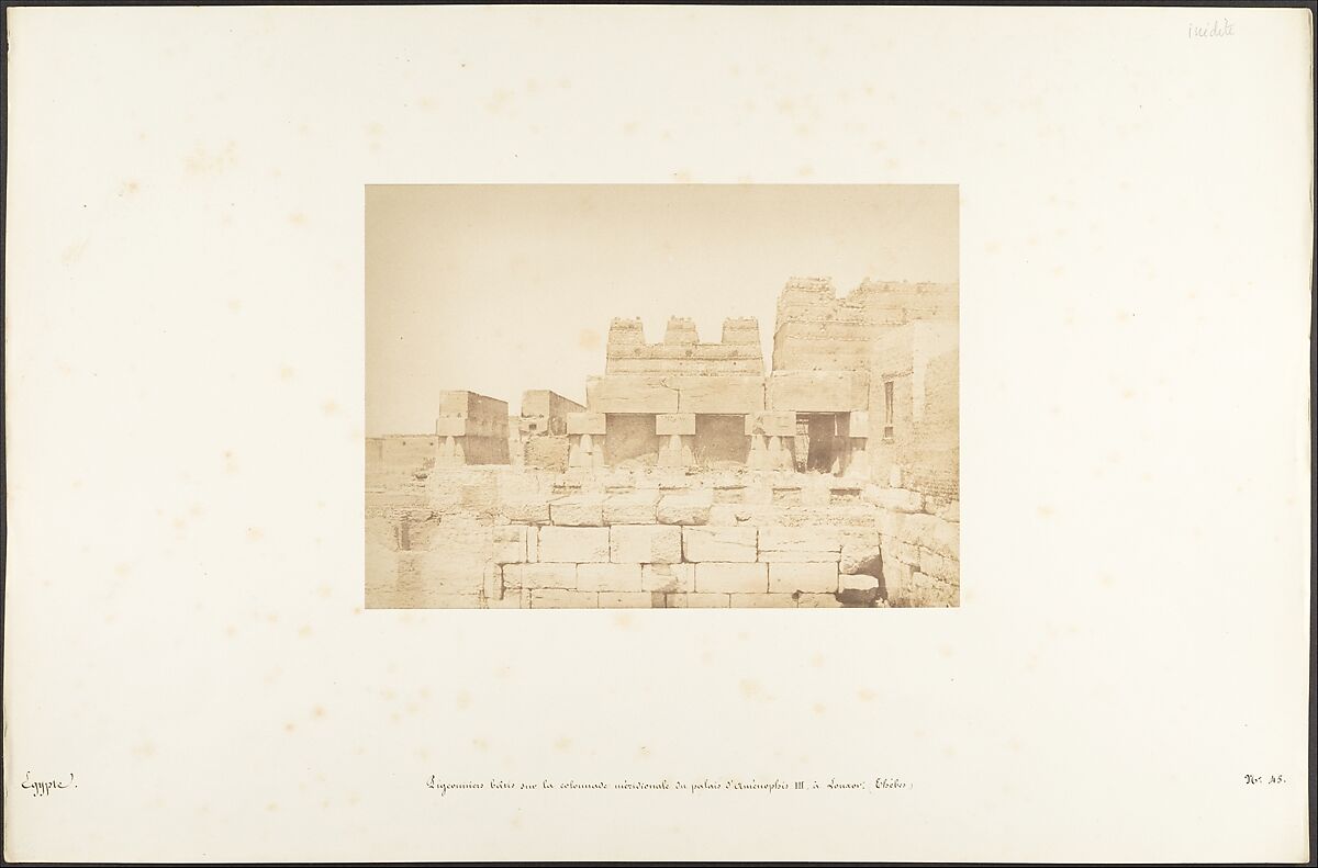 Maxime Du Camp's mission to Egypt and the Near East in 1849-51 to make a photographic survey of monuments and sites is well documented in his writings and in those of his fellow traveler, Gustave Flaubert. After an initial stay in Cairo, the two friends hired a boat to take them up the Nile as far as the second cataract, after which they descended the river at leisure, exploring the archaeological sites along its banks. In July 1850 they left Egypt for Palestine, Turkey, and Greece before they parted in Italy the following April. Du Camp's album "Egypte, Nubie, Palestine et Syrie," published in 1852 and containing 125 photographs printed by Blanquart-Evrard, brought its author instant fame. In addition to the published edition, Du Camp arranged for a private printing of a few portfolios, such as the one in the Gilman collection, which numbers 174 images particularly noteworthy for their warm color and luminescence. Possibly printed in Gustave Le Gray's studio, the present portfolio is