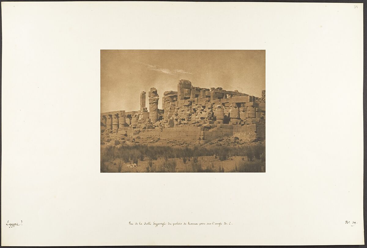 Maxime Du Camp's mission to Egypt and the Near East in 1849-51 to make a photographic survey of monuments and sites is well documented in his writings and in those of his fellow traveler, Gustave Flaubert. After an initial stay in Cairo, the two friends hired a boat to take them up the Nile as far as the second cataract, after which they descended the river at leisure, exploring the archaeological sites along its banks. In July 1850 they left Egypt for Palestine, Turkey, and Greece before they parted in Italy the following April. Du Camp's album "Egypte, Nubie, Palestine et Syrie," published in 1852 and containing 125 photographs printed by Blanquart-Evrard, brought its author instant fame. In addition to the published edition, Du Camp arranged for a private printing of a few portfolios, such as the one in the Gilman collection, which numbers 174 images particularly noteworthy for their warm color and luminescence. Possibly printed in Gustave Le Gray's studio, the present portfolio is