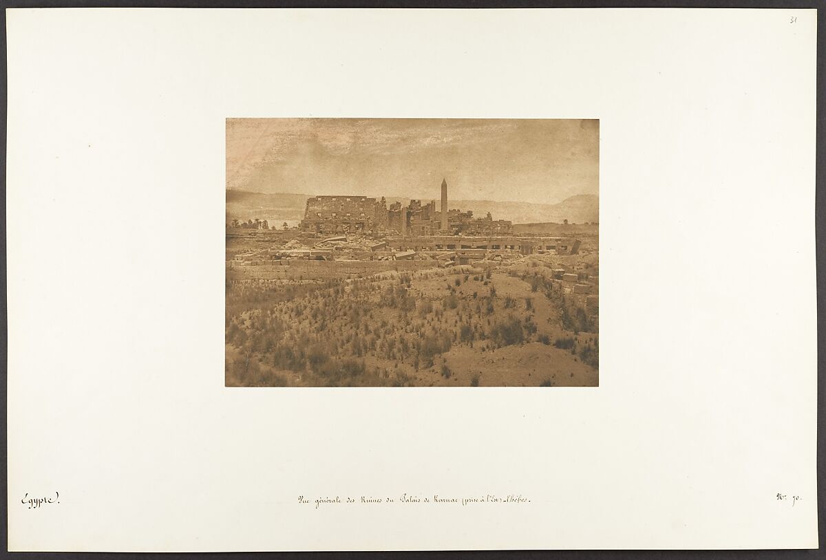 Maxime Du Camp's mission to Egypt and the Near East in 1849-51 to make a photographic survey of monuments and sites is well documented in his writings and in those of his fellow traveler, Gustave Flaubert. After an initial stay in Cairo, the two friends hired a boat to take them up the Nile as far as the second cataract, after which they descended the river at leisure, exploring the archaeological sites along its banks. In July 1850 they left Egypt for Palestine, Turkey, and Greece before they parted in Italy the following April. Du Camp's album "Egypte, Nubie, Palestine et Syrie," published in 1852 and containing 125 photographs printed by Blanquart-Evrard, brought its author instant fame. In addition to the published edition, Du Camp arranged for a private printing of a few portfolios, such as the one in the Gilman collection, which numbers 174 images particularly noteworthy for their warm color and luminescence. Possibly printed in Gustave Le Gray's studio, the present portfolio is
