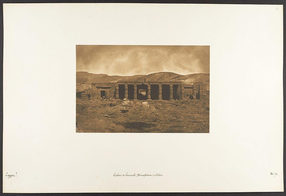 Maxime Du Camp's mission to Egypt and the Near East in 1849-51 to make a photographic survey of monuments and sites is well documented in his writings and in those of his fellow traveler, Gustave Flaubert. After an initial stay in Cairo, the two friends hired a boat to take them up the Nile as far as the second cataract, after which they descended the river at leisure, exploring the archaeological sites along its banks. In July 1850 they left Egypt for Palestine, Turkey, and Greece before they parted in Italy the following April. Du Camp's album "Egypte, Nubie, Palestine et Syrie," published in 1852 and containing 125 photographs printed by Blanquart-Evrard, brought its author instant fame. In addition to the published edition, Du Camp arranged for a private printing of a few portfolios, such as the one in the Gilman collection, which numbers 174 images particularly noteworthy for their warm color and luminescence. Possibly printed in Gustave Le Gray's studio, the present portfolio is