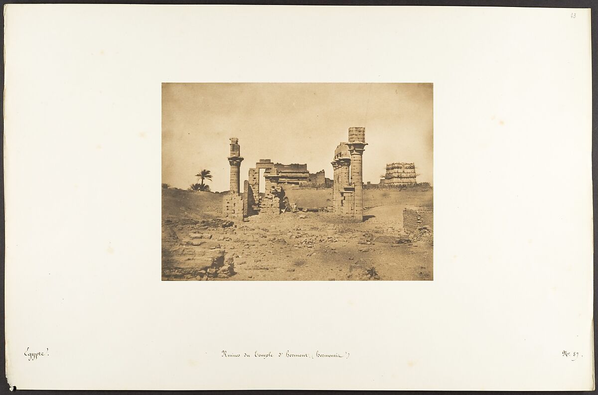 Maxime Du Camp's mission to Egypt and the Near East in 1849-51 to make a photographic survey of monuments and sites is well documented in his writings and in those of his fellow traveler, Gustave Flaubert. After an initial stay in Cairo, the two friends hired a boat to take them up the Nile as far as the second cataract, after which they descended the river at leisure, exploring the archaeological sites along its banks. In July 1850 they left Egypt for Palestine, Turkey, and Greece before they parted in Italy the following April. Du Camp's album "Egypte, Nubie, Palestine et Syrie," published in 1852 and containing 125 photographs printed by Blanquart-Evrard, brought its author instant fame. In addition to the published edition, Du Camp arranged for a private printing of a few portfolios, such as the one in the Gilman collection, which numbers 174 images particularly noteworthy for their warm color and luminescence. Possibly printed in Gustave Le Gray's studio, the present portfolio is