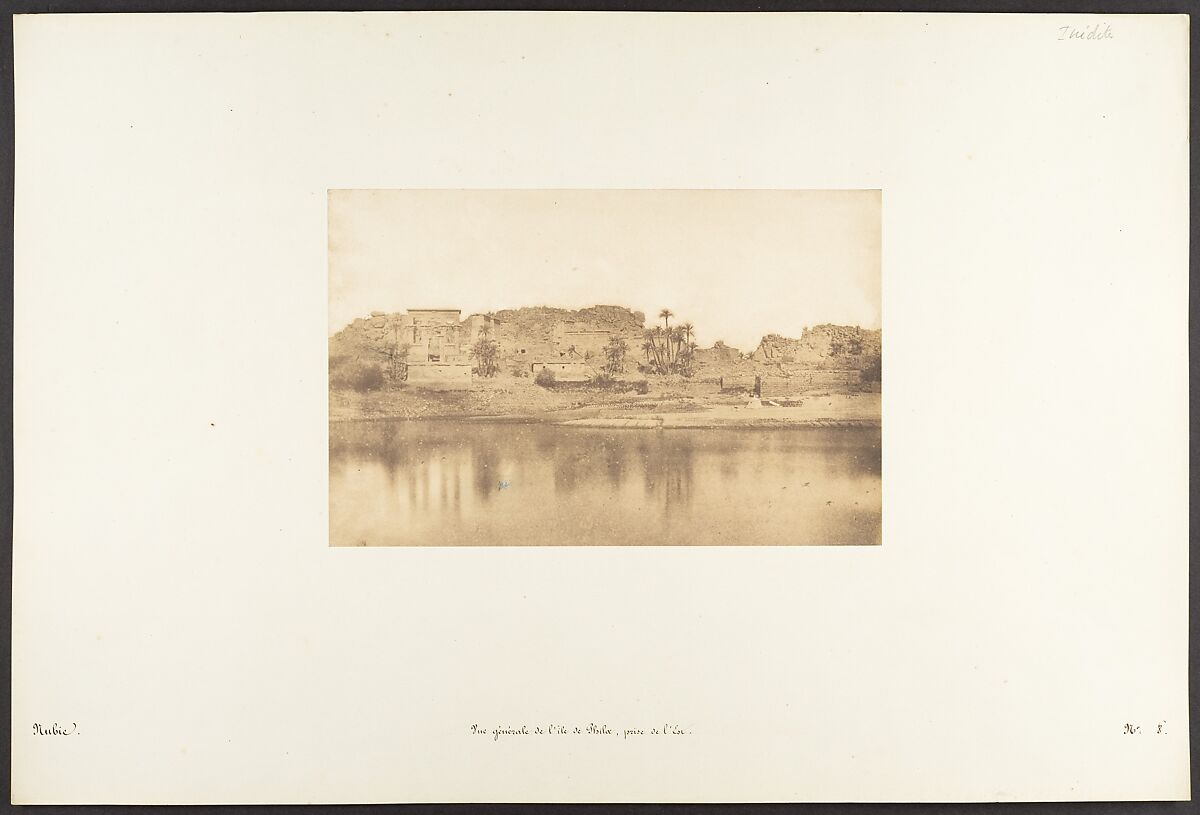 Maxime Du Camp's mission to Egypt and the Near East in 1849-51 to make a photographic survey of monuments and sites is well documented in his writings and in those of his fellow traveler, Gustave Flaubert. After an initial stay in Cairo, the two friends hired a boat to take them up the Nile as far as the second cataract, after which they descended the river at leisure, exploring the archaeological sites along its banks. In July 1850 they left Egypt for Palestine, Turkey, and Greece before they parted in Italy the following April. Du Camp's album "Egypte, Nubie, Palestine et Syrie," published in 1852 and containing 125 photographs printed by Blanquart-Evrard, brought its author instant fame. In addition to the published edition, Du Camp arranged for a private printing of a few portfolios, such as the one in the Gilman collection, which numbers 174 images particularly noteworthy for their warm color and luminescence. Possibly printed in Gustave Le Gray's studio, the present portfolio is