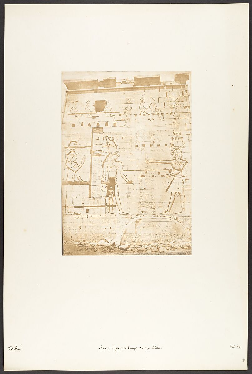 Maxime Du Camp's mission to Egypt and the Near East in 1849-51 to make a photographic survey of monuments and sites is well documented in his writings and in those of his fellow traveler, Gustave Flaubert. After an initial stay in Cairo, the two friends hired a boat to take them up the Nile as far as the second cataract, after which they descended the river at leisure, exploring the archaeological sites along its banks. In July 1850 they left Egypt for Palestine, Turkey, and Greece before they parted in Italy the following April. Du Camp's album "Egypte, Nubie, Palestine et Syrie," published in 1852 and containing 125 photographs printed by Blanquart-Evrard, brought its author instant fame. In addition to the published edition, Du Camp arranged for a private printing of a few portfolios, such as the one in the Gilman collection, which numbers 174 images particularly noteworthy for their warm color and luminescence. Possibly printed in Gustave Le Gray's studio, the present portfolio is