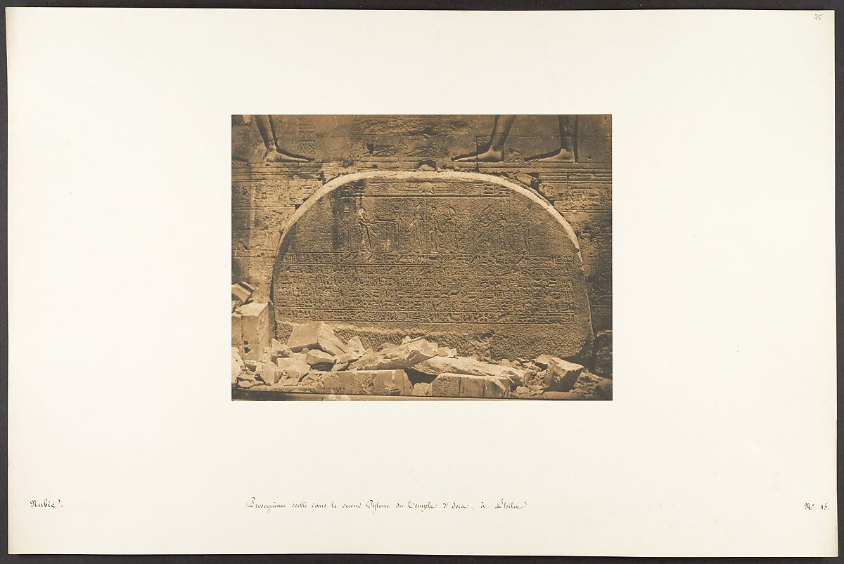 Maxime Du Camp's mission to Egypt and the Near East in 1849-51 to make a photographic survey of monuments and sites is well documented in his writings and in those of his fellow traveler, Gustave Flaubert. After an initial stay in Cairo, the two friends hired a boat to take them up the Nile as far as the second cataract, after which they descended the river at leisure, exploring the archaeological sites along its banks. In July 1850 they left Egypt for Palestine, Turkey, and Greece before they parted in Italy the following April. Du Camp's album "Egypte, Nubie, Palestine et Syrie," published in 1852 and containing 125 photographs printed by Blanquart-Evrard, brought its author instant fame. In addition to the published edition, Du Camp arranged for a private printing of a few portfolios, such as the one in the Gilman collection, which numbers 174 images particularly noteworthy for their warm color and luminescence. Possibly printed in Gustave Le Gray's studio, the present portfolio is