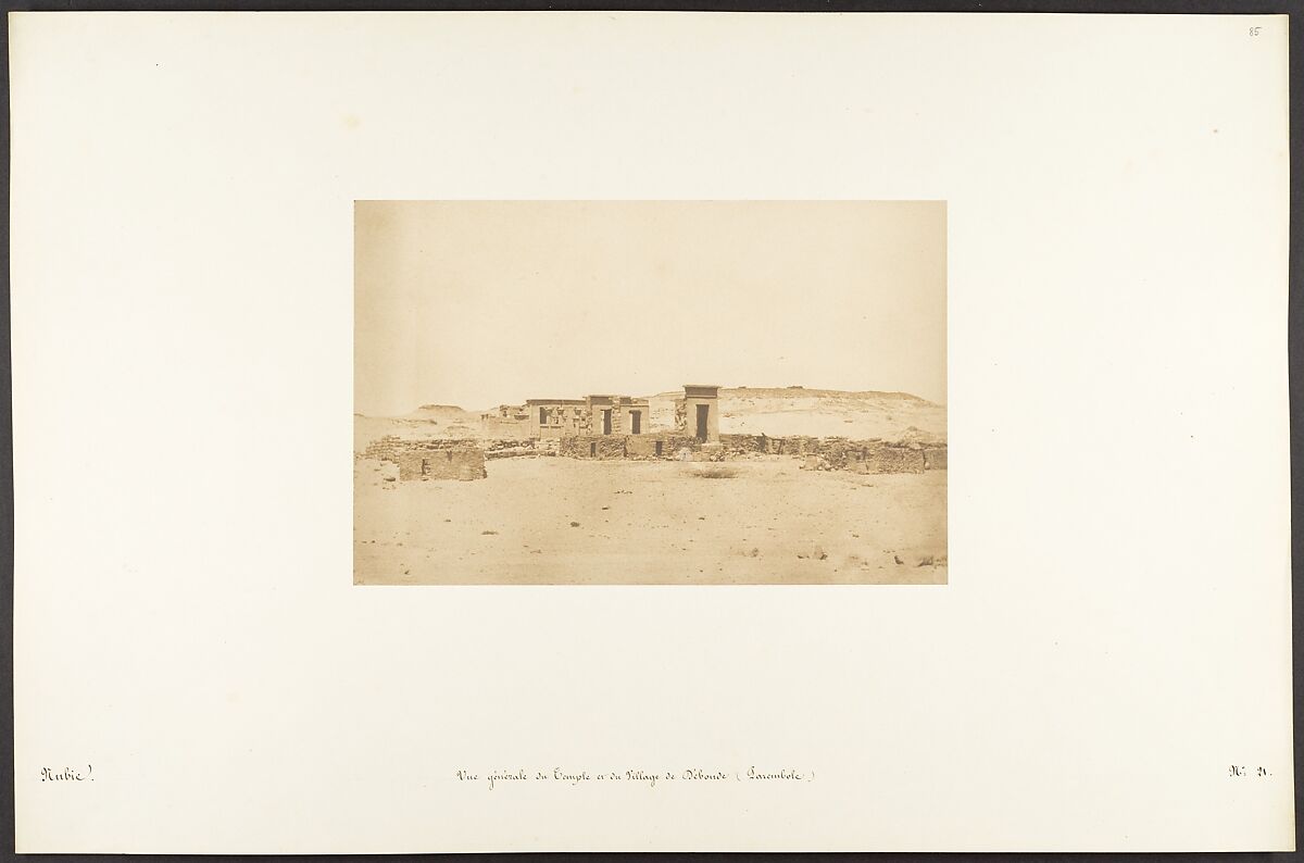 Maxime Du Camp's mission to Egypt and the Near East in 1849-51 to make a photographic survey of monuments and sites is well documented in his writings and in those of his fellow traveler, Gustave Flaubert. After an initial stay in Cairo, the two friends hired a boat to take them up the Nile as far as the second cataract, after which they descended the river at leisure, exploring the archaeological sites along its banks. In July 1850 they left Egypt for Palestine, Turkey, and Greece before they parted in Italy the following April. Du Camp's album "Egypte, Nubie, Palestine et Syrie," published in 1852 and containing 125 photographs printed by Blanquart-Evrard, brought its author instant fame. In addition to the published edition, Du Camp arranged for a private printing of a few portfolios, such as the one in the Gilman collection, which numbers 174 images particularly noteworthy for their warm color and luminescence. Possibly printed in Gustave Le Gray's studio, the present portfolio is