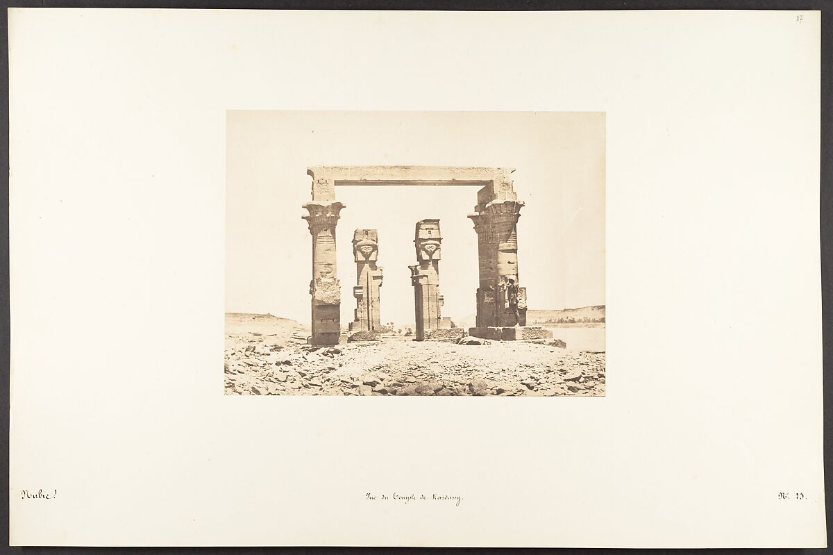 Maxime Du Camp's mission to Egypt and the Near East in 1849-51 to make a photographic survey of monuments and sites is well documented in his writings and in those of his fellow traveler, Gustave Flaubert. After an initial stay in Cairo, the two friends hired a boat to take them up the Nile as far as the second cataract, after which they descended the river at leisure, exploring the archaeological sites along its banks. In July 1850 they left Egypt for Palestine, Turkey, and Greece before they parted in Italy the following April. Du Camp's album "Egypte, Nubie, Palestine et Syrie," published in 1852 and containing 125 photographs printed by Blanquart-Evrard, brought its author instant fame. In addition to the published edition, Du Camp arranged for a private printing of a few portfolios, such as the one in the Gilman collection, which numbers 174 images particularly noteworthy for their warm color and luminescence. Possibly printed in Gustave Le Gray's studio, the present portfolio is