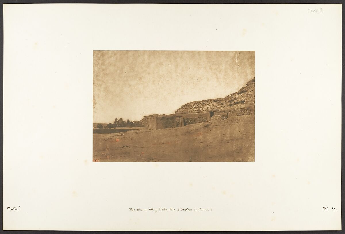 Maxime Du Camp's mission to Egypt and the Near East in 1849-51 to make a photographic survey of monuments and sites is well documented in his writings and in those of his fellow traveler, Gustave Flaubert. After an initial stay in Cairo, the two friends hired a boat to take them up the Nile as far as the second cataract, after which they descended the river at leisure, exploring the archaeological sites along its banks. In July 1850 they left Egypt for Palestine, Turkey, and Greece before they parted in Italy the following April. Du Camp's album "Egypte, Nubie, Palestine et Syrie," published in 1852 and containing 125 photographs printed by Blanquart-Evrard, brought its author instant fame. In addition to the published edition, Du Camp arranged for a private printing of a few portfolios, such as the one in the Gilman collection, which numbers 174 images particularly noteworthy for their warm color and luminescence. Possibly printed in Gustave Le Gray's studio, the present portfolio is