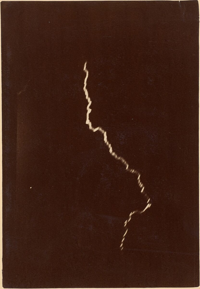 As part of a late-nineteenth-century global contingent of scientists dedicated to the documentation of electrical storms, Charles Moussette was a pioneer of lightning photography in France. Like other like-minded researchers, Moussette was determined to prove that artistic renderings of lightning as zigzagging bolts were unrealistic. He made his most famous images from his laboratory in Arcueil, outside Paris, as a thunderstorm subsided around 9:45 p.m. on May 12, 1886. On a single glass plate negative, he recorded two bolts of lightning to the northwest and, by enlarging a portion of his negative, he provided visual evidence of the blast’s irregular spiral form. Moussette published his image in 1886 and exhibited his photographs at the Royal Meteorological Society in 1888, alongside displays of meteoric iron (alleged thunderbolts), lightning rods, and articles of clothing reportedly torn off a man by lightning strikes.