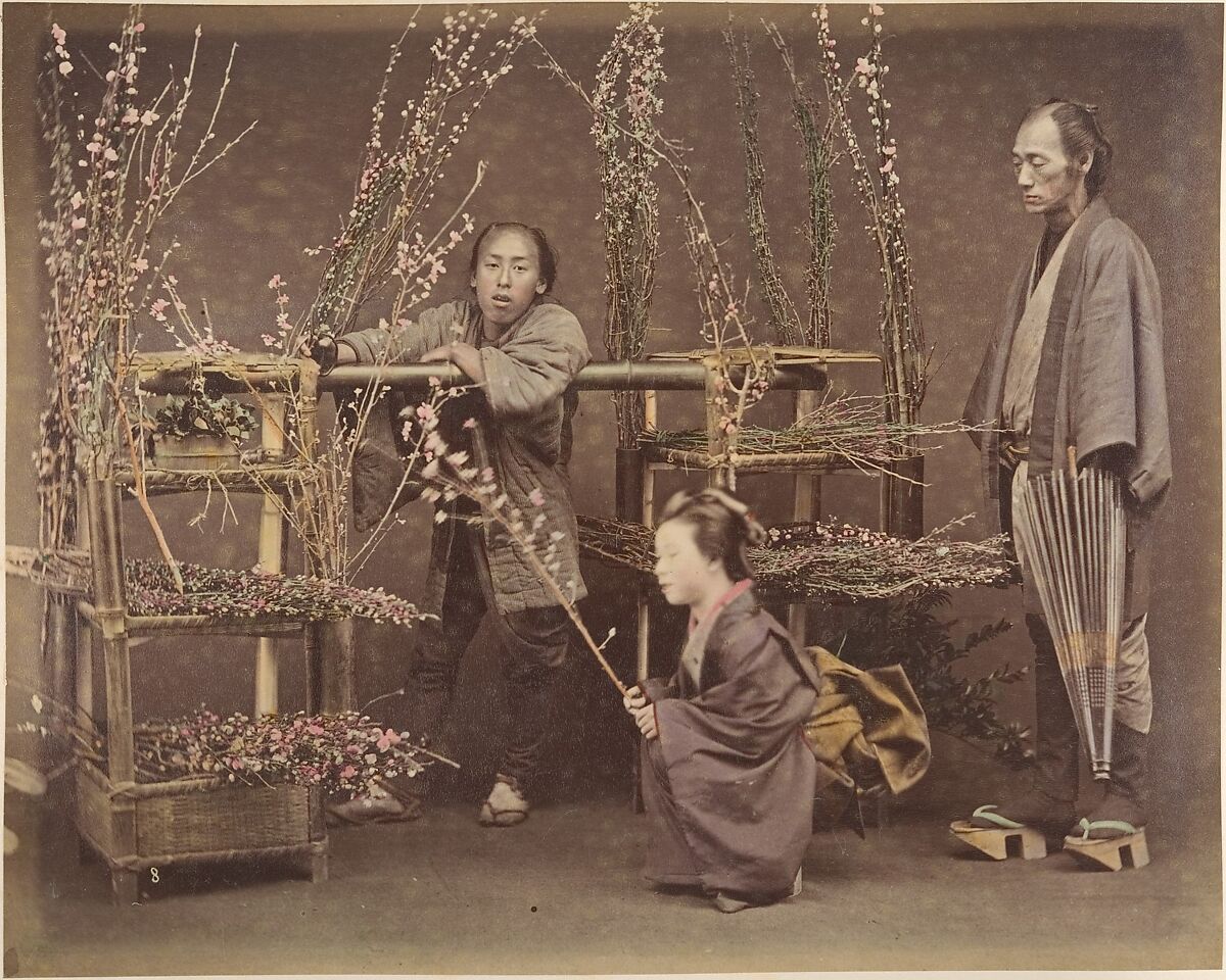 - Title: [Two Japanese Men and One Japanese Woman Posing with Flowering Branches]