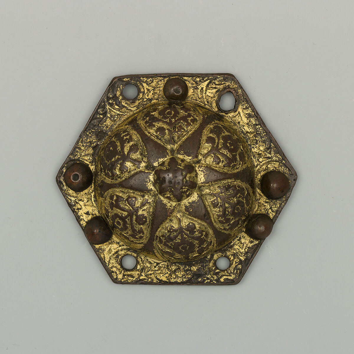 This boss, decorated all over with flowers and foliage, adorned the cross-section of the three straps of a horse breast collar (straps preventing the saddle from slipping backwards). This example is a simpler version of the luxury bosses attached to some Ottoman deluxe tacks, usually made of silver and gold.