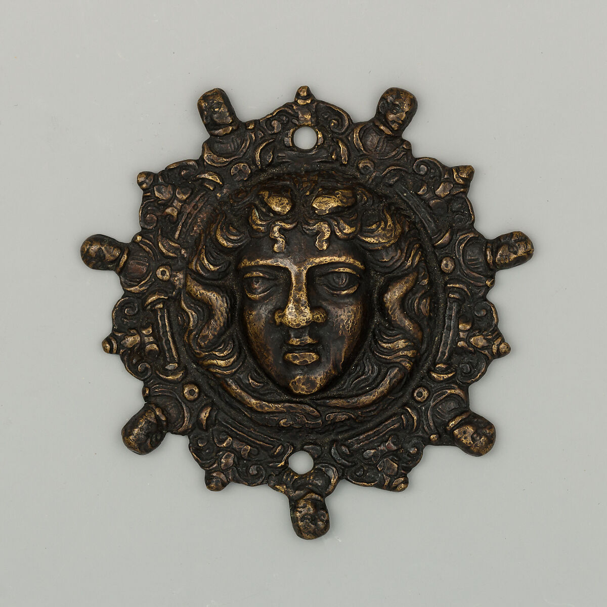 Italian bronze founders also used the same design of Medusa’s head for ornamental plaquettes, used for adorning several types of objects including staff weapons (see 14.25.354).