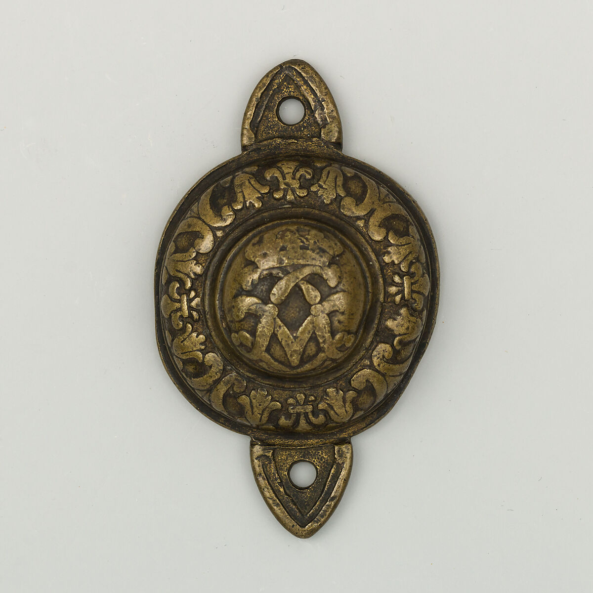 The rim of this bit boss is decorated with four fleurs-de-lis. At its center are the two interlaced Ls of King Louis XIV (r. 1643-1715) or, more likely, King Louis XV (r. 1715-1774), crowned at the top. What looks like a letter V behind the monogram is actually a very simplified representation of the two crossed palms often seen on this kind of composition.