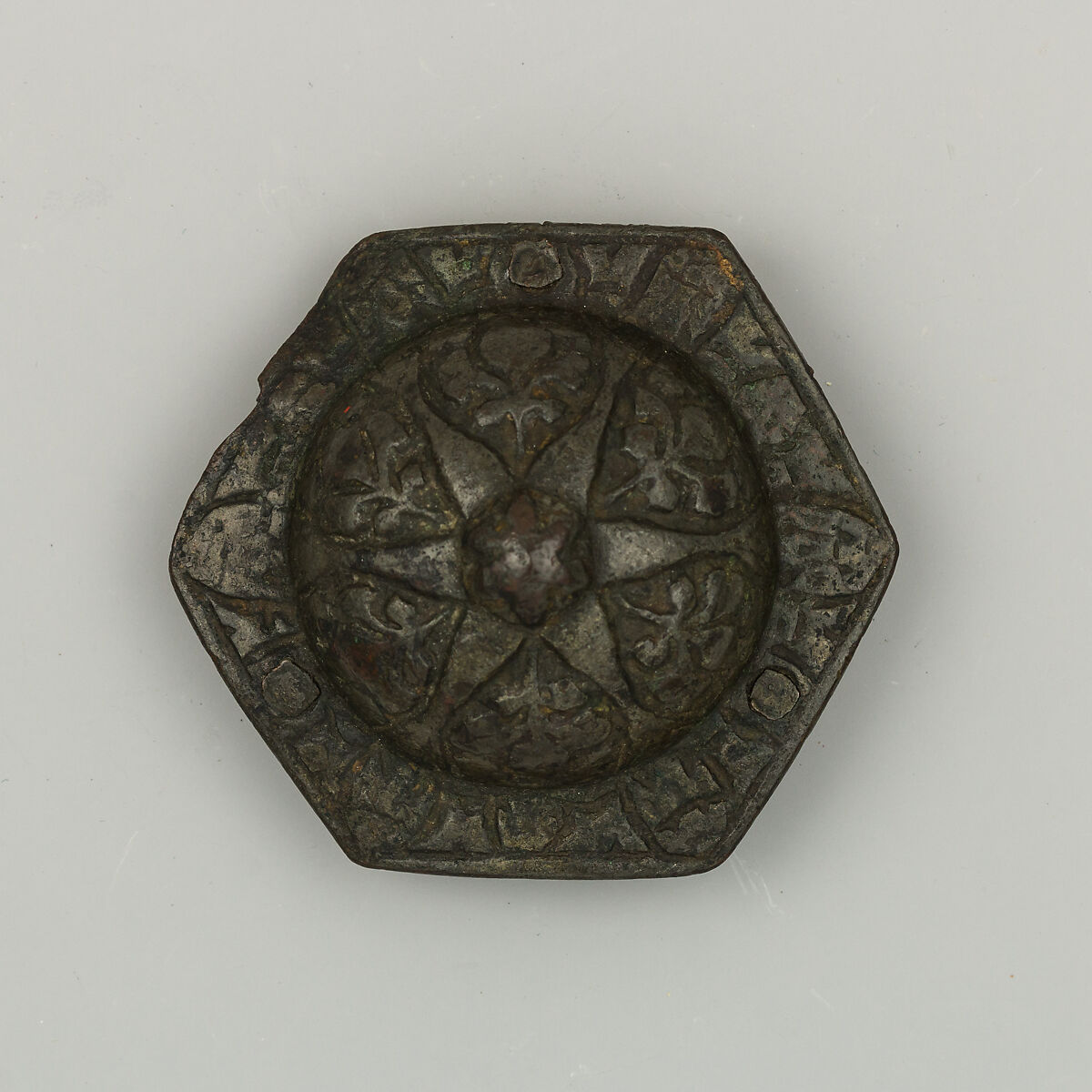 This boss, decorated all over with flowers and foliage, adorned the cross-section of the three straps of a horse breast collar (straps preventing the saddle from slipping backwards). This example is a simpler version of the luxury bosses attached to some Ottoman deluxe tacks, usually made of silver and gold.