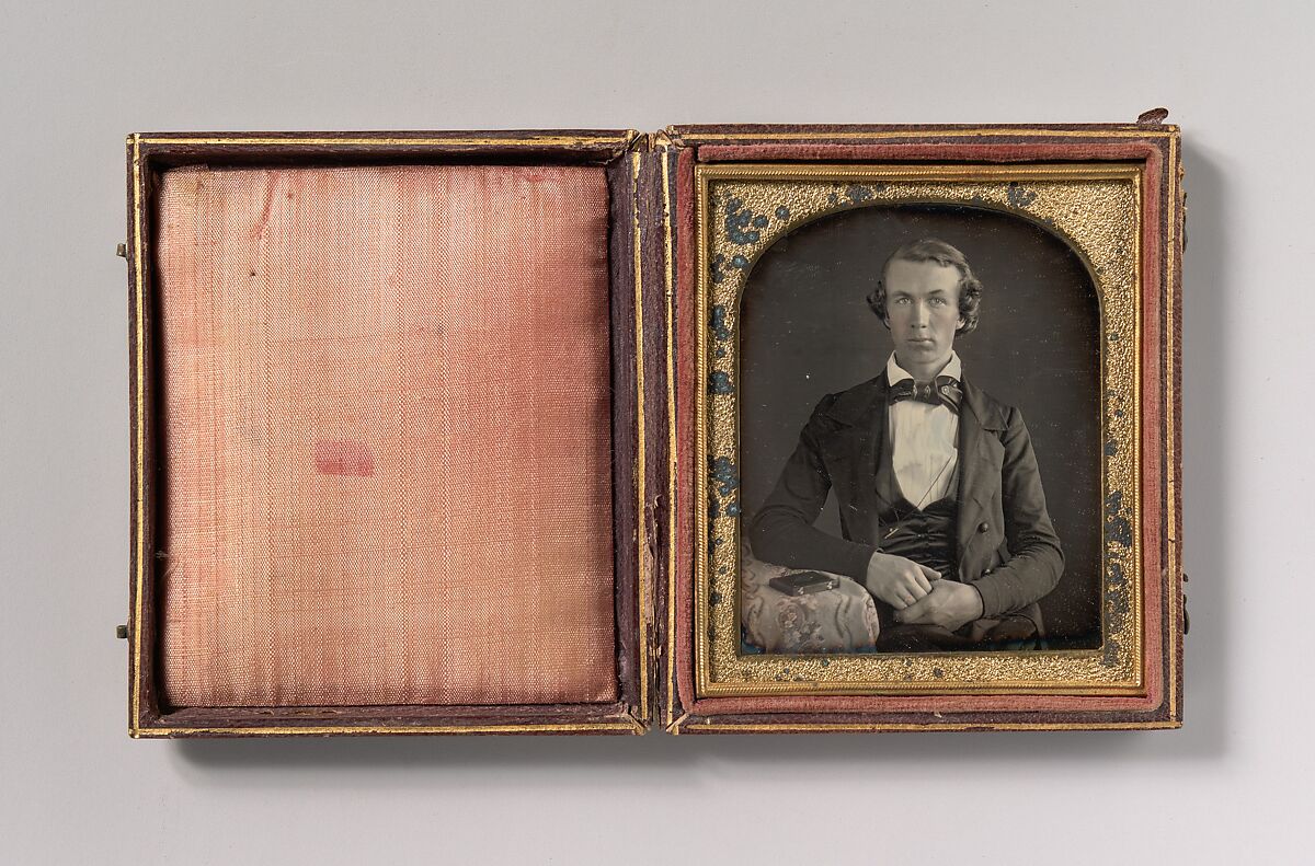 The daguerreotype, the first photographic process, was invented by Louis-Jacques-Mandé Daguerre (French, 1787–1851) and spread rapidly around the world after its presentation to the public in Paris in 1839. Exposed in a camera obscura and developed in mercury vapors, each highly polished silvered copper plate is a unique photograph that, when viewed in proper light, exhibits extraordinary detail and three-dimensionality. The daguerreotype soon became extremely popular in the United States, where in the 1840s and 1850s thousands of daguerreotypists vied for clients from Boston and New York to San Francisco. The new medium’s success here was built upon the patronage of the average citizen who desired a simple likeness to keep or, perhaps, to send to a loved one in the era’s most enduring pledge of friendship.