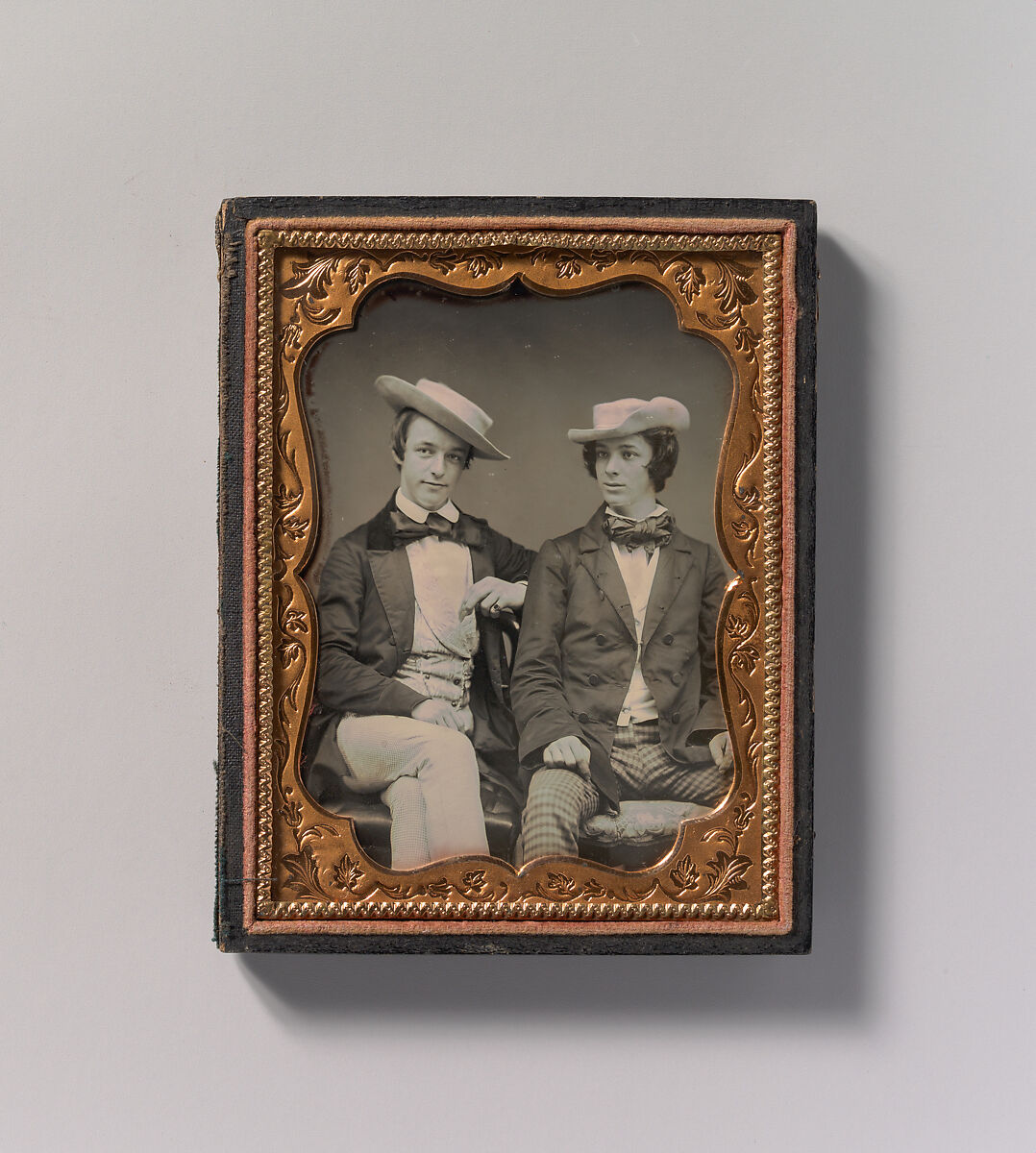 - Title:[Two Seated Young Men Wearing Gingham Trousers, Bow Ties, and Brimmed, Soft Hats]