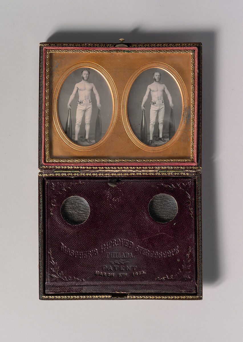 - Title:[Stereoscopic Case, Partially Nude Strongman Holding Indian Clubs]