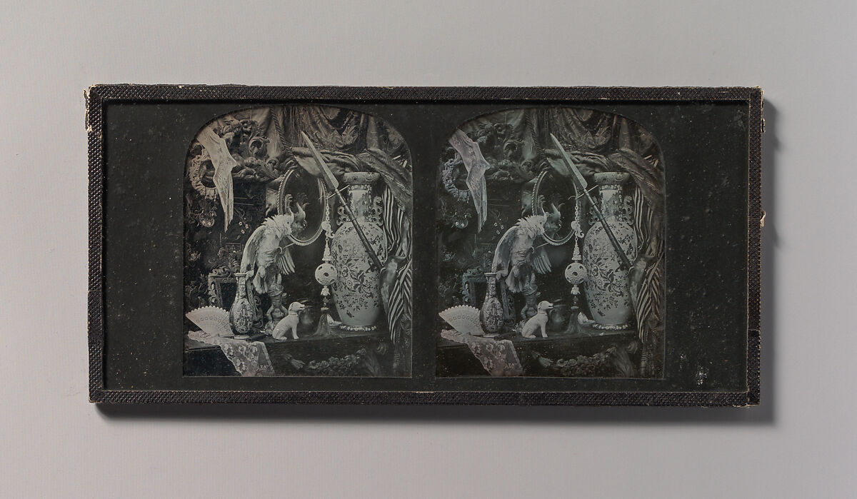 [Still-Life with Cockatoo, Mirror, Ornamental Ball, Vases, and Lace]