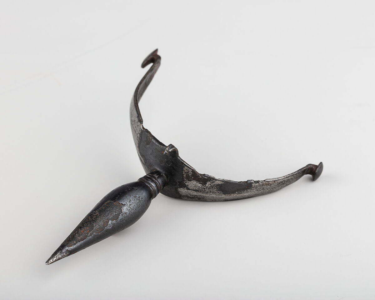 This exceptional spur has features in common with Germanic and Gallo-Roman examples from around the 3rd century. However its size and width make it very unusual, as spurs from this period are normally very small. The spur was secured to the foot by the means of straps attached to the side buttons and to the small hook shaped as a small stylized horse’s head.