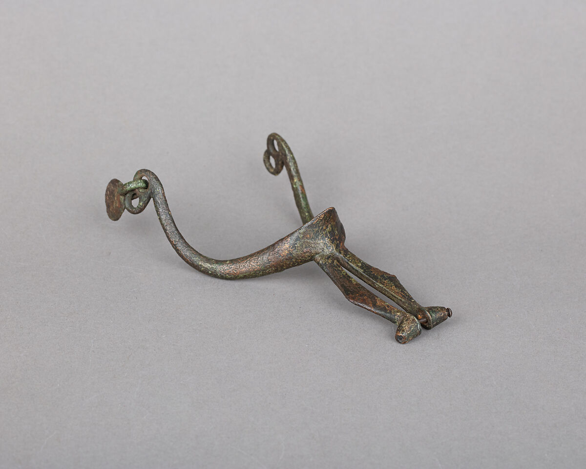 The large rowel of this spur is now missing. The first rowel spurs, featuring a revolving disc or star at the end of the neck, appeared in Western Europe around the mid-13th century. They cohabitated with the earlier form, the prick spur, for about a century, before replacing it almost completely in Europe by the mid-14th century. The advantage of the rowel spur over the prick was it allowed the rider to reach the flanks of its horse with one of the points whatever the angle of its foot, which was very convenient regarding the riding position of the time, with long stirrups-leathers and extended legs. The fact that the rowel rolled against the horse instead of hitting it directly reduced also the probability of injuring it too seriously.