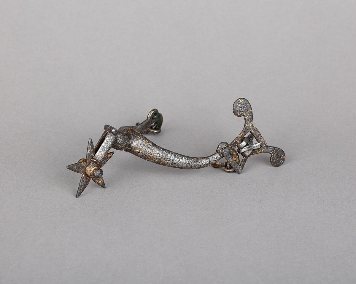 This spur is decorated overall with stamped floral designs originally entirely gilded. In the first half of the 17th century, the fashion trend for gentlemen was to wear boots and spurs even non-riding circumstances, including for dancing or walking around at court. Spurs became then more than equestrian tools, but pieces of male jewelry often enriched by the same goldsmiths also working on armor and weapons. Their decoration was sometimes intended to match the sword hilt and the general outfit and horse tack of their owner. These trendy accessories were also a significant mark of status for gentlemen, sometimes nonetheless copied by the bourgeoisie. This fashion progressively disappeared after the mid-17th century.