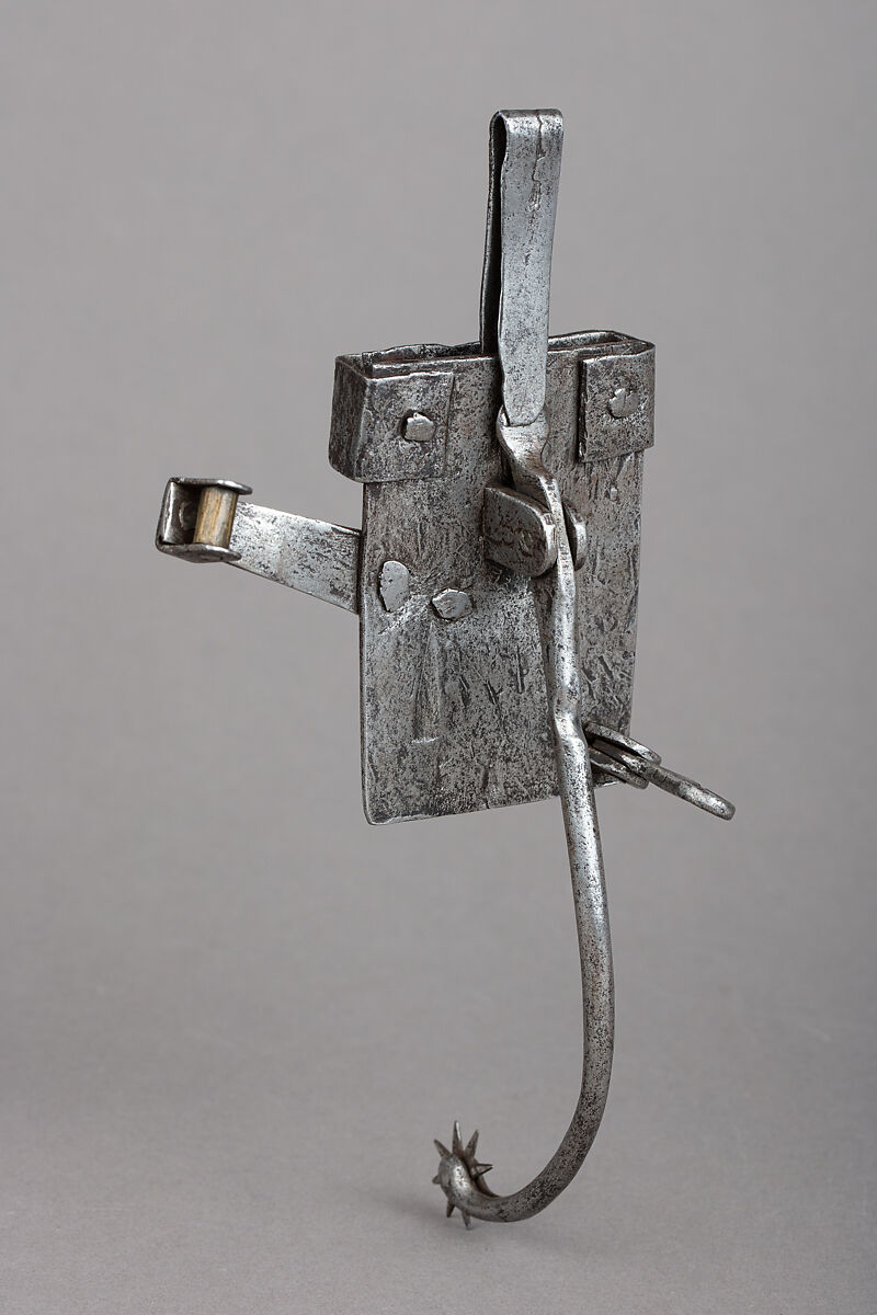 The purpose of this spur is uncertain. It might have been used by a lady on a side saddle, though this it would have been strange, since using a regular spur on her left foot would have been easier. Maybe this mechanical spur, of which no other example is known, was used by a rider with an amputated left leg.