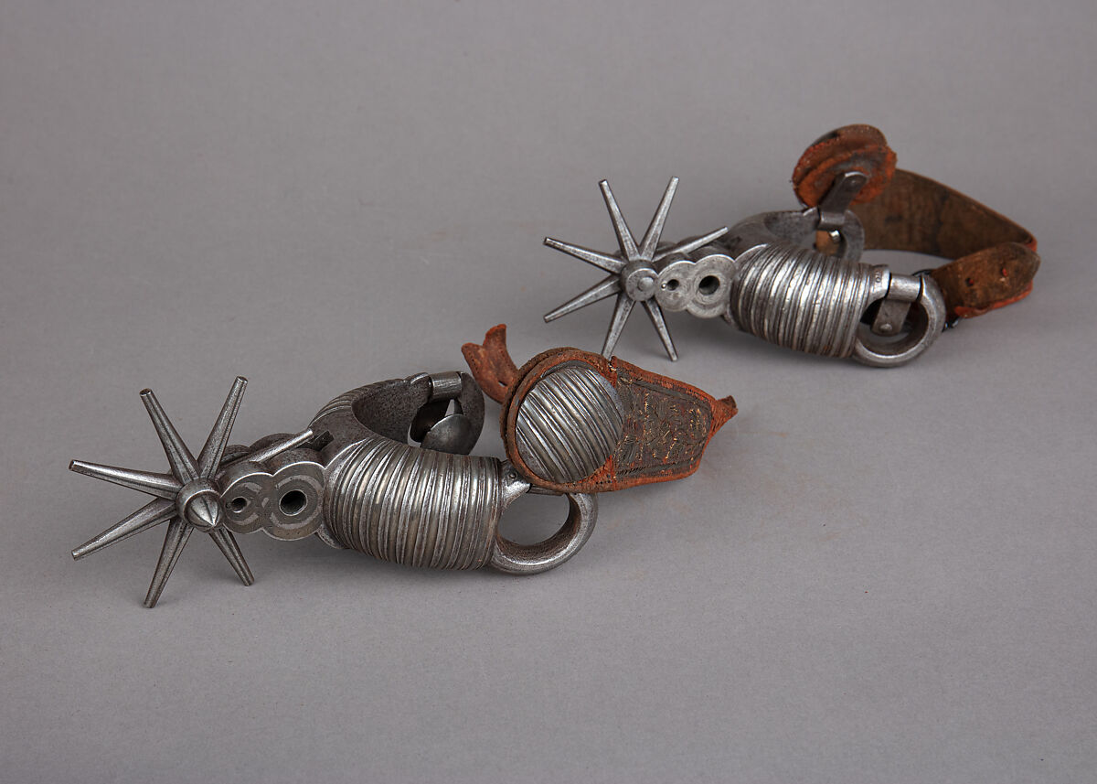 This type of spur, featuring a thick and rounded heel band, was very popular among Mexican charros (Mexican cowboys), in the late 19th century and the first decades of the 20th century. The silver-inlaid striped decoration is typical of the Chihuahua style, where they may have been made. They retain their original leather straps, embroidered with silver thread.