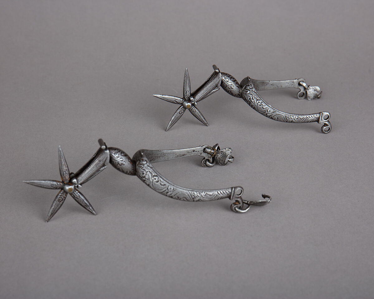 These spurs. originally gilded, are decorated overall with punched foliate designs. In the first half of the 17th century, the fashion trend for gentlemen was to wear boots and spurs even non-riding circumstances, including for dancing or walking around at court. Spurs became then more than equestrian tools, but pieces of male jewelry often enriched by the same goldsmiths also working on armor and weapons. Their decoration was sometimes intended to match the sword hilt and the general outfit and horse tack of their owner. These trendy accessories were also a significant mark of status for gentlemen, sometimes nonetheless copied by the bourgeoisie. This fashion progressively disappeared after the mid 17th century.