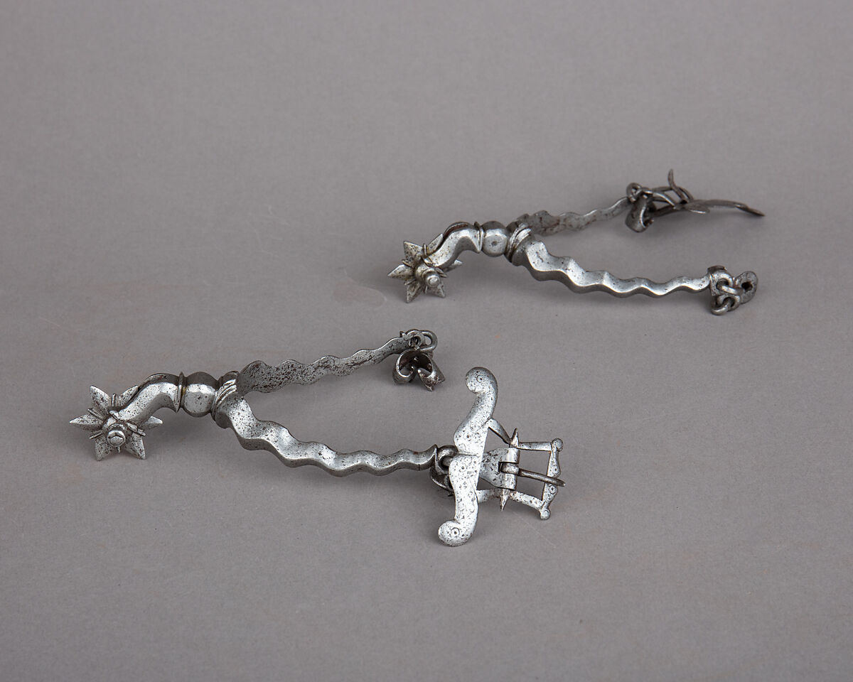Despite their simple shapes these spurs are skillfully chiseled overall with a waving motif giving them a particularly sculptural aspect. In the first half of the 17th century spurs became true fashion accessories often worn outside the equestrian context, and some of them were real pieces of jewelry. Even if these spurs are simpler and more practical than some of their luxurious contemporaries, their decorative features give them enough elegance to align it with this idea.