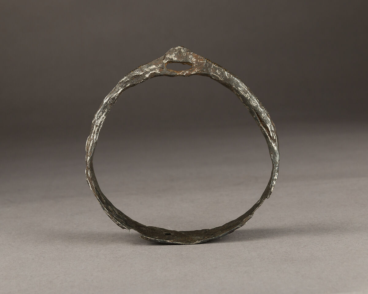 This stirrup of Slavic type, found in East Prussia (today in northern Poland) includes the remains of silver inlaid decoration on the branches. Its circular shape reflects the influence of central Asian types.