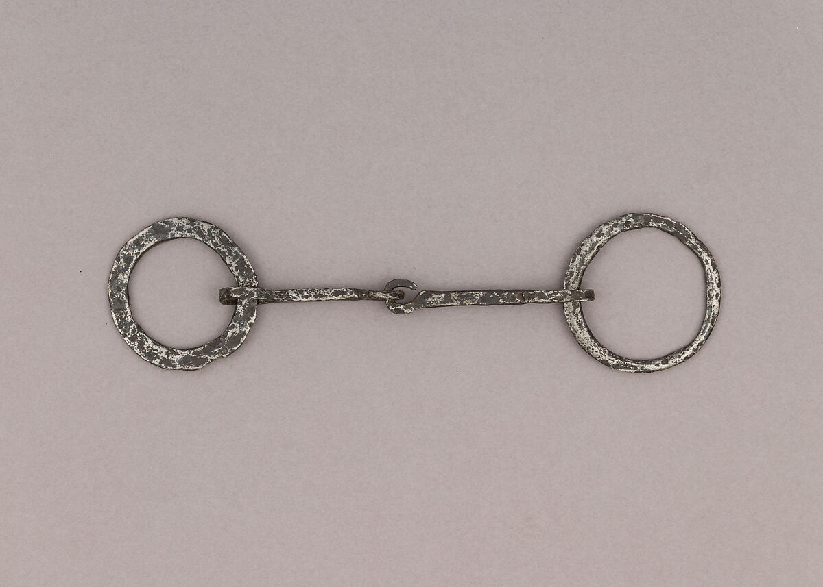 The snaffle bit is the simplest type of horse bit, and has an effect on the bars (part of the horses’ jaw without teeth) and the corners of the lips. The rings on the sides would serve to hang the bit on the headstall, attach the reins, as well as hold the mouthpiece in place.