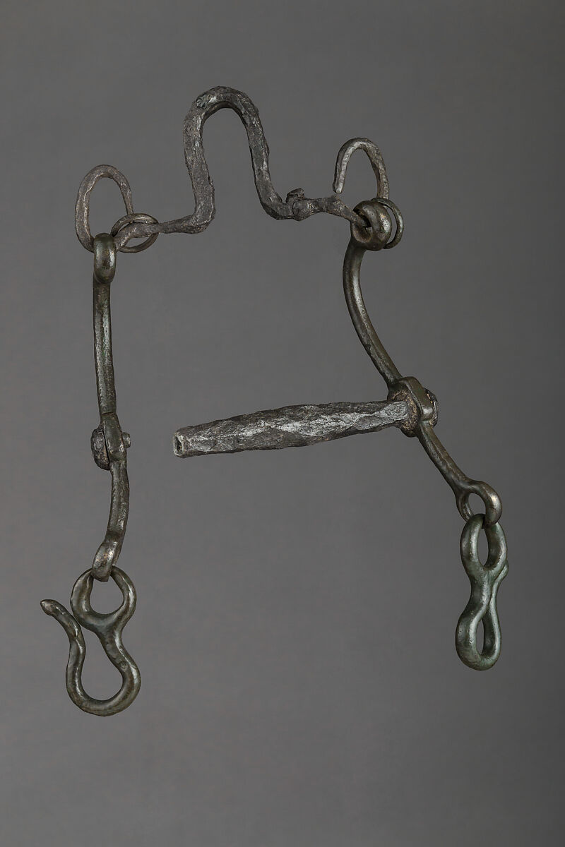 This object is also an example of the earliest type of curb bit to have been invented. It seems to have developed in the Balkans among Thracian and Scordisci (Eastern Celts) cultures between the 3rd and 1st century B.C. These populations were known for their great equestrian skills, especially at war. Examples of these bits have also occasionally been found in some western Celtic burials dating from the 1st century B.C., but they mostly spread in Roman territories during the conquest, thanks to the Thracian and East Celtic cavalrymen incorporated in the army. Curb bits were actually an improvement in military technology, since they allowed riders to have very good control of their horses with only one hand, freeing the other for holding a weapon. From at least the 1st century B.C., this kind of bit was often associated with a type of leverage cavesson, called a psálion, a metal noseband helping in the control of the horse (see acc. no. 42.50.527 in the Metropolitan Museum's collection).