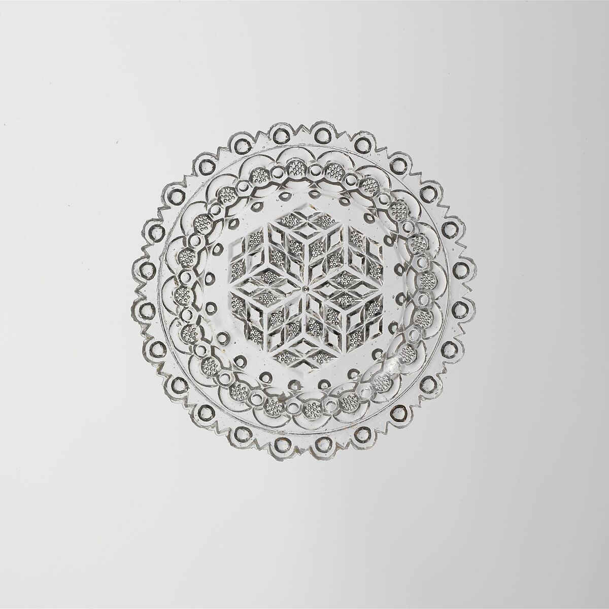 This cup plate is pressed in the "Roman rosette" pattern.