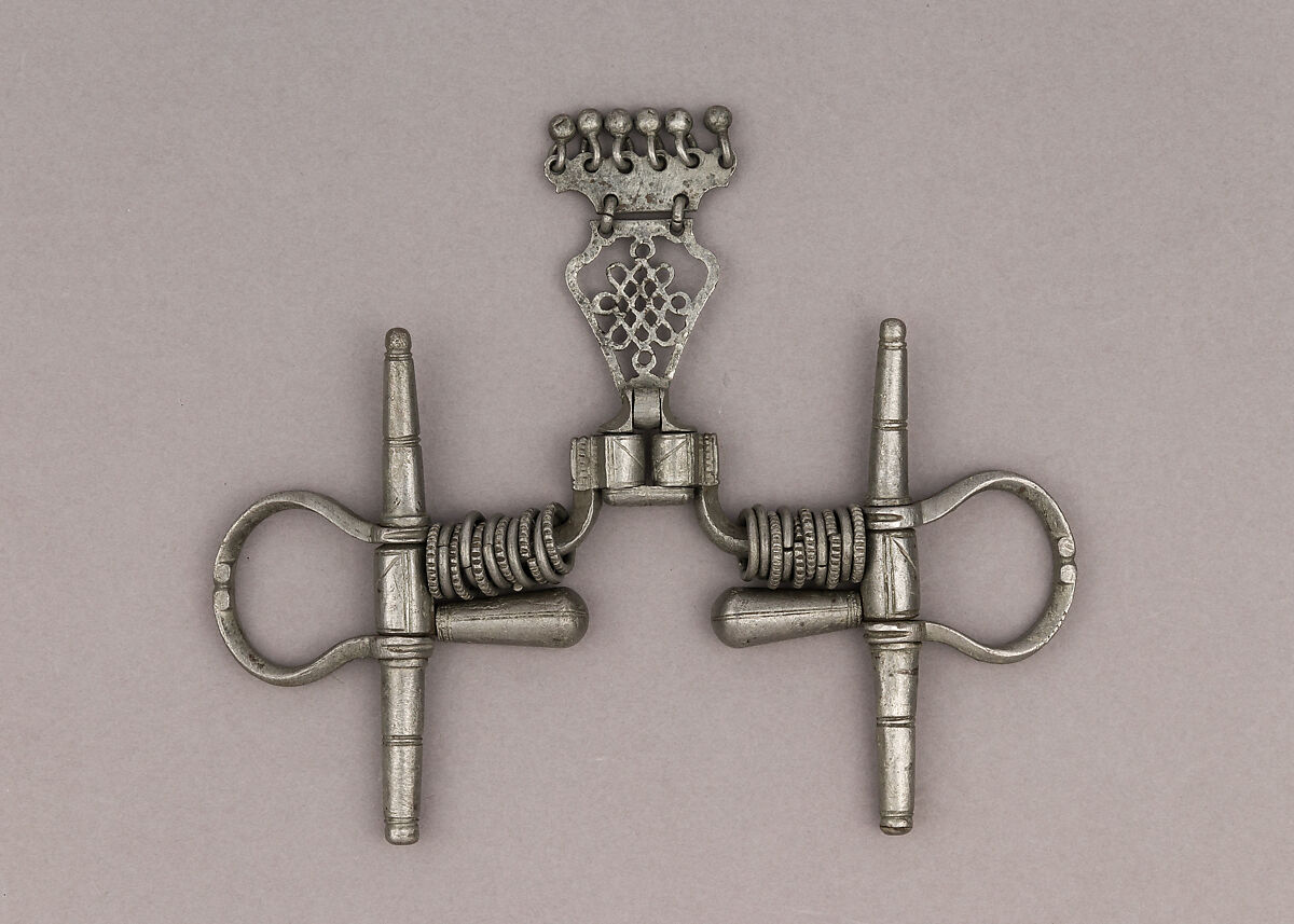 According to contemporary equestrian manuals, the mouthpiece of this strong snaffle bit was made for very bad mouths, very thick tongues and low bars (part of the horses’ jaw without teeth). The central pendant, adorned with a pierced interlaced motif, with its small hanging beads, was meant to ‘entertain’ the horse, who, by playing with it with its tongue, would salivate and relax its jaw.