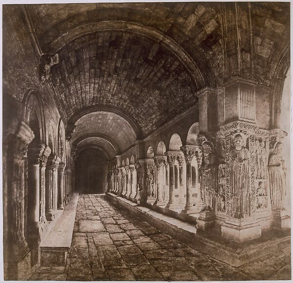 This work of art is currently on loan to the museum.At the Romanesque church of Saint-Trophime in Arles, Baldus used his cut-and-paste technique to construct a view of an ornately carved, barrel-vaulted cloister. Baldus made about a dozen exposures of the cloister, each focused and properly exposed for its portion of the scene. He then cut and joined the negatives along the contours of columns and cornices, yielding a print with visible seams that he retouched with ink. He also used brush and ink to retouch the negatives themselves, clarifying details and painting in sections of stonework. The result is a paradoxical document, at once meticulously faithful to its subject and thoroughly fabricated.