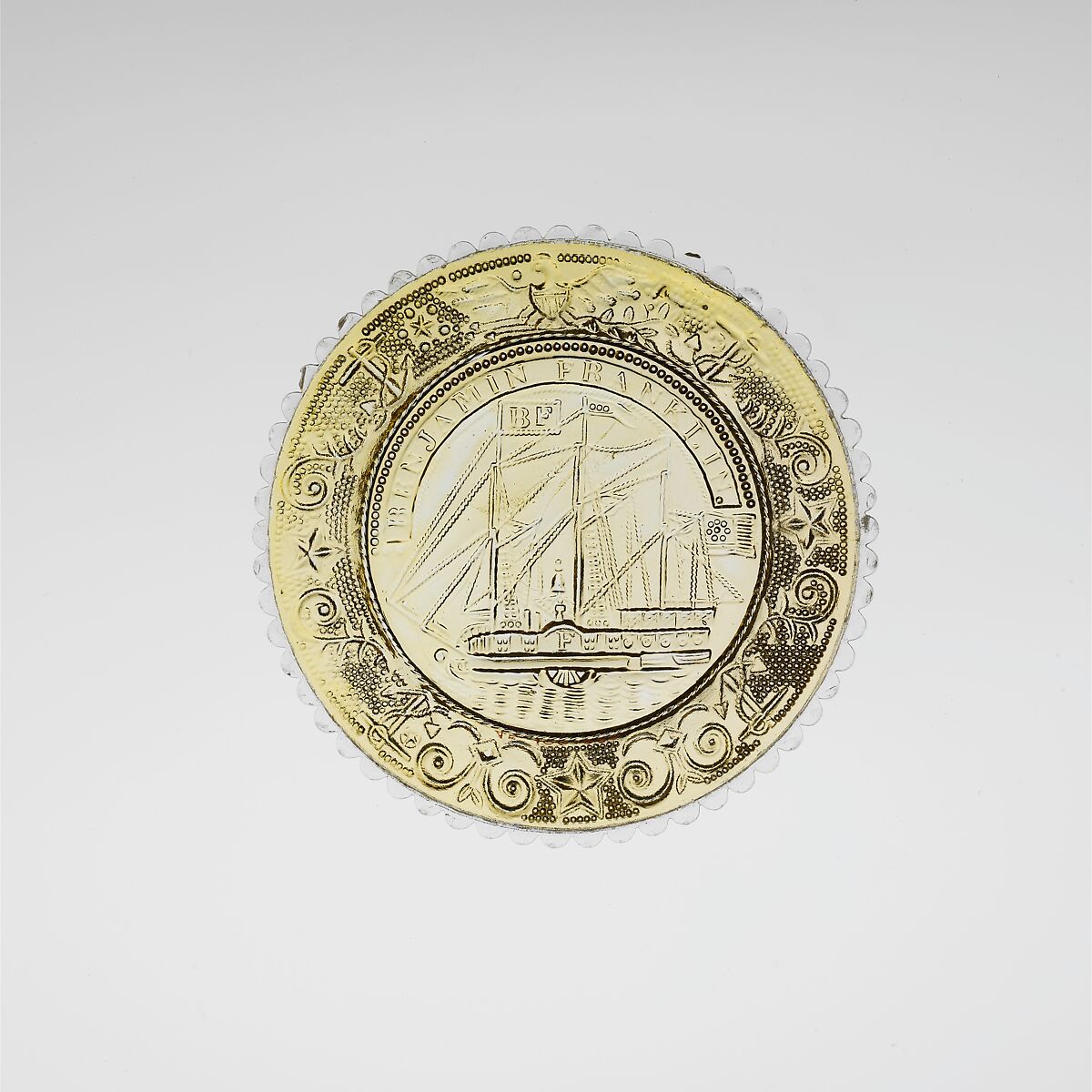 The pressed design of this cup plate commemorates the steamship Benjamin Franklin's visit to Boston in 1829.