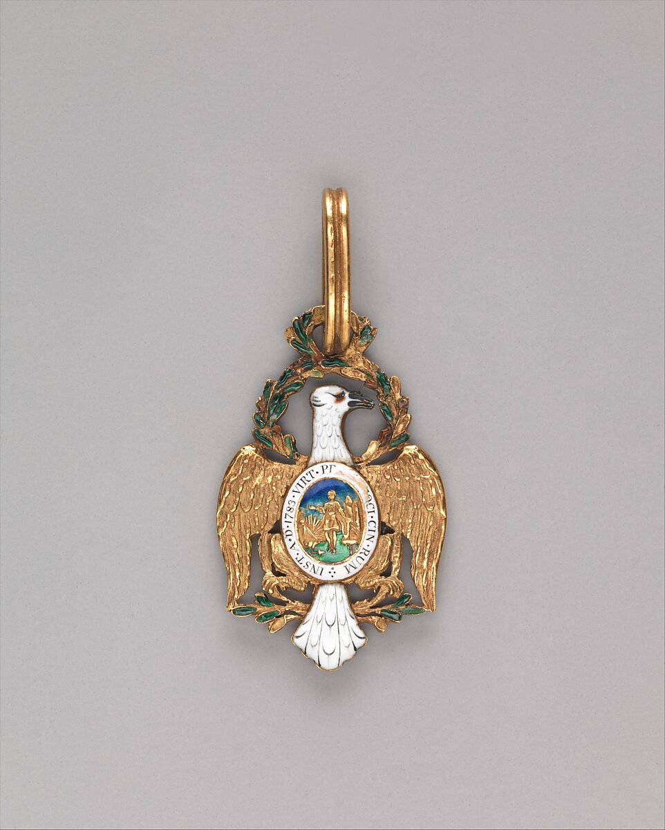 This is one of the original Society of the Cincinnati medals, fabricated during L'Enfant's visit to France. Crafted of yellow gold and embellished with colored enamels, it would originally have hung from a blue ribbon edged in white. The medal was made for Major Samuel Nicholas of Philadelphia and descended in his family until its acquisition by the Metropolitan Museum in 1935.