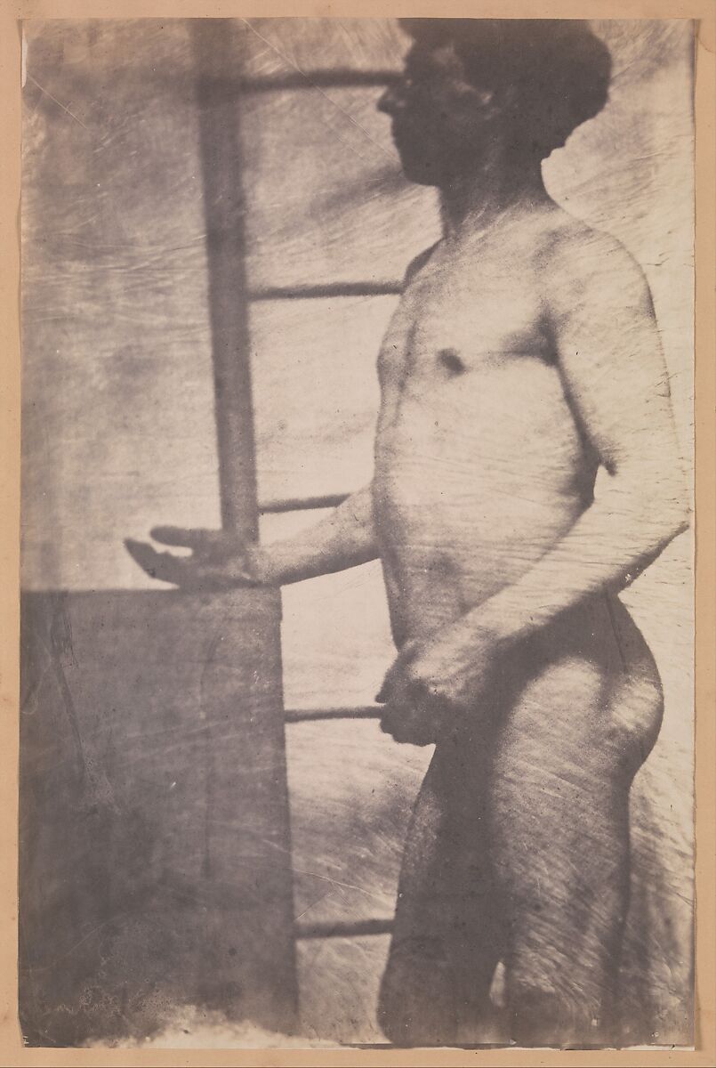 The original impulse behind these boldly ambitious figure studies may have been to aid a painter or sculptor, but they are nonetheless without parallel in the early history of photography. Enlarged to the size of drawn académies—drawings of the live model that were a standard part of art instruction in France—their scale alone sets them apart from the more modest productions of Vallou de Villeneuve, Durieu, and other artists of the 1850s. More unusually, the images are interrupted by a surface pattern that gives the impression that the photographs are printed on finely pleated silk rather than paper—likely the result of a technical error. Instead of wiping clean his glass-plate negatives and starting over as virtually all other photographers would have done, this artist recognized that the pattern created a veil that, like time or memory, removed the images from their merely utilitarian purpose and elevated them from the mundane to the realm of art.