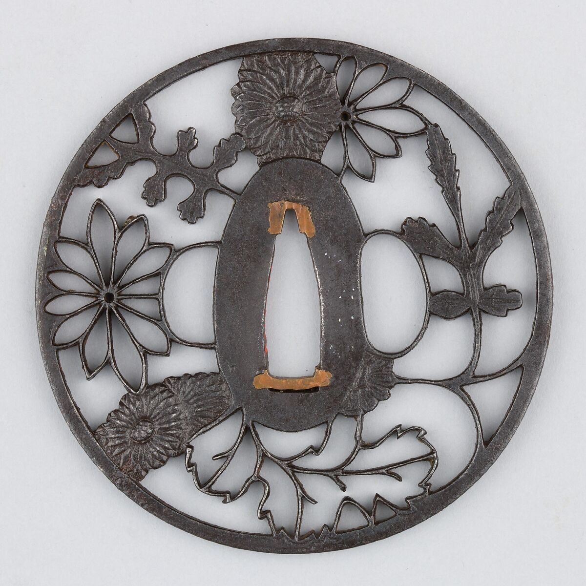 This tsuba features an openwork design of chrysanthemums.