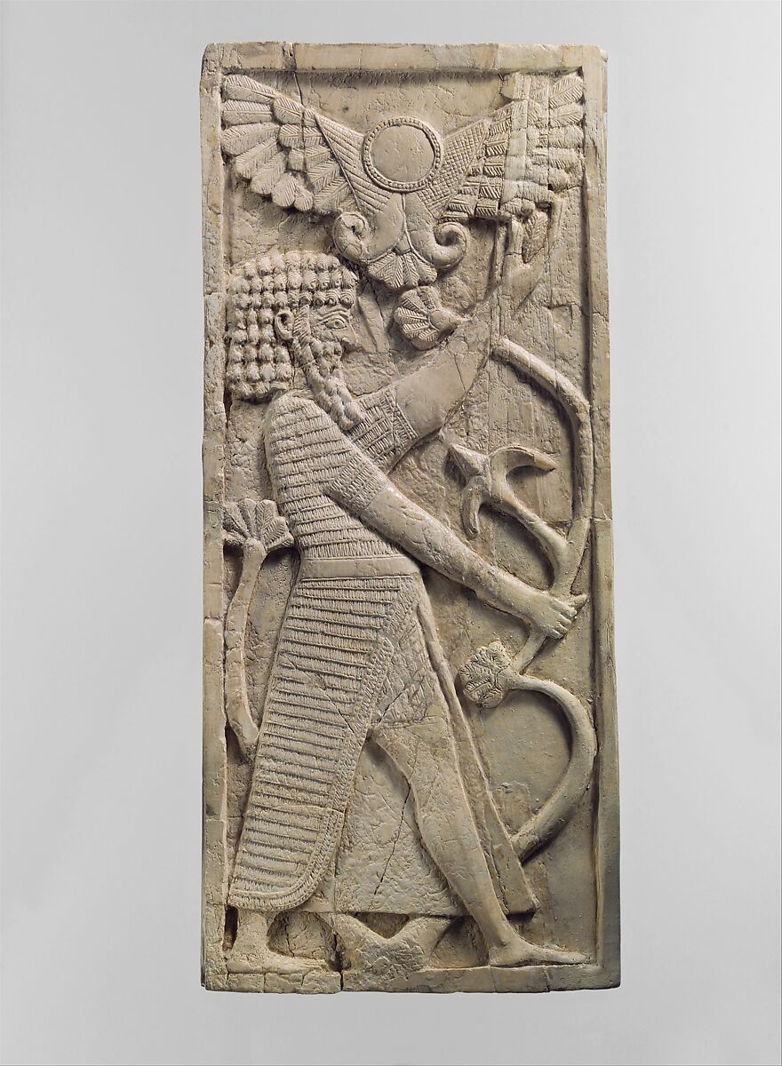 This ivory carving would have been one of a group of similar panels used in the back of a chair. It depicts a bearded man, perhaps a warrior, holding the stem of a lotus plant. Above him, a winged disc provides protection.