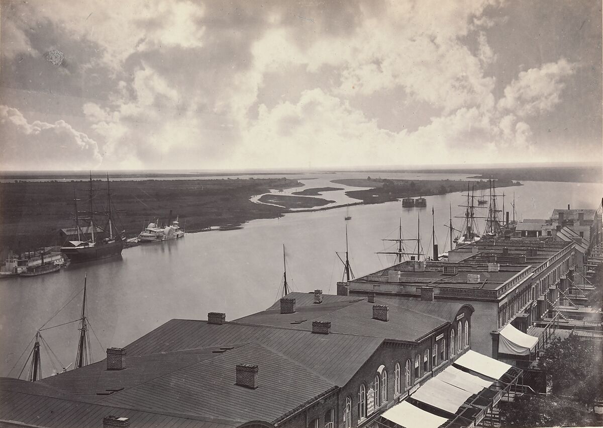In the last quarter of Photographic Views of Sherman's Campaign, Barnard presents ten views of South Carolina and five of Savannah, Georgia, focusing on sections of the city that had been spared destruction. From an aerie in the cupola of the customhouse, he made two photographs—not a panorama but a pair of images to which he added cloud-filled skies. Savannah, Georgia, No. 2 is a magnificent diagonal composition that features the wide Savannah River and the meandering line of marshlands that meets the sea at the horizon. The photograph balances the commerce of ships on the far bank of the river with the awnings shading the entrances to marine shops that had reopened for business after the war. This photograph is a clear depiction of Southern commerce at the beginning of Reconstruction.