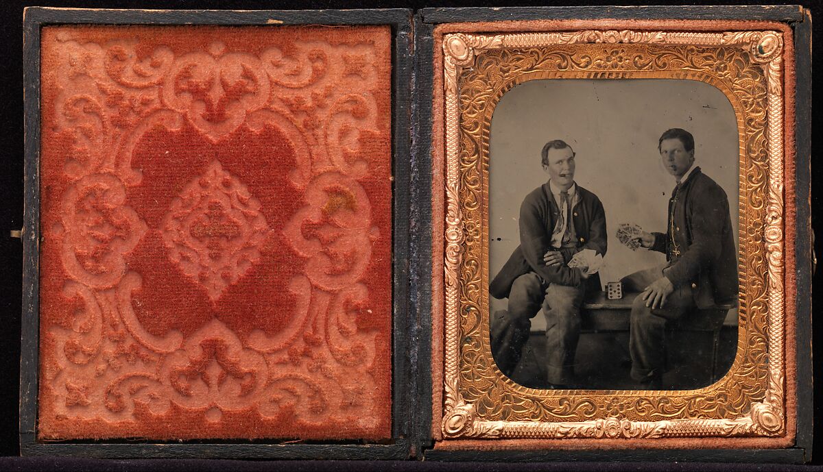 During the war, not every hour of every day was devoted to fighting, marching, and drilling. To pass the time in the field and in the semi-permanents camps during the long winter months when the war essentially stopped, soldiers in the North and the South entertained themselves with games of cards, checkers, chess, and dominoes. In this informal tintype, a pair of Union soldiers share a bench, a smoke, and a game of cards.