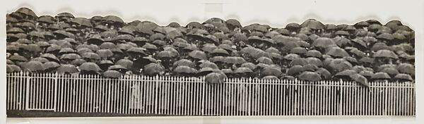 This work of art is currently on loan to the museum.Nicholls, a freelance press photographer who specialized in images of Edwardian high society, was typical of the first generation of professional photojournalists in his supple approach to photographic truth. If his camera failed to adequately capture his experience of an event, he had no qualms about combining elements from different negatives to create a more compelling image—a fact he rarely acknowledged in his captions. To enhance the impression of swarming crowds at Epsom Downs one rainy Derby Day, he cloned several groups of umbrella-toting spectators and pasted them into unoccupied areas in his original image.