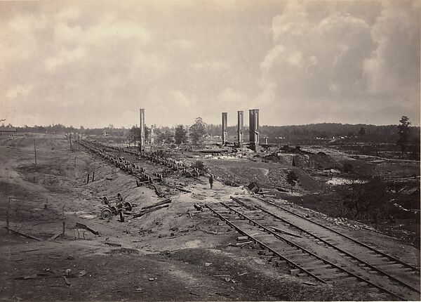 This work of art is currently on loan to the museum.This dramatic bird’s-eye view documents the aftermath of the destruction of a Confederate military train filled with gunpowder. When abandoning Atlanta, Confederate General John Bell Hood ordered his troops to set the boxcars on fire so that the Union army would never be able to make use of the train. The explosion also completely leveled the nearby mill, leaving evidence of only a few rail wheels and axles.