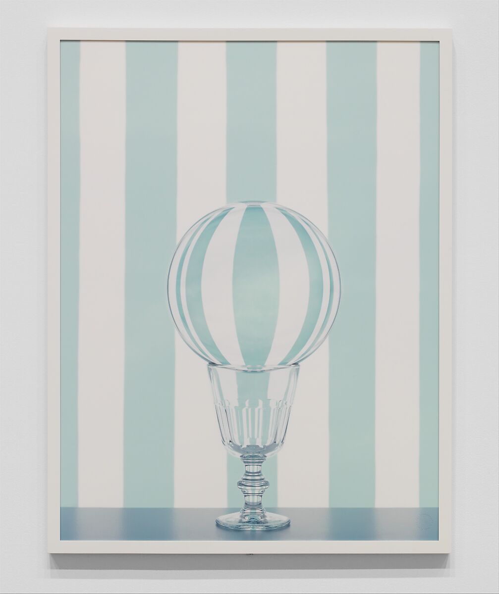 Using only the available light in her studio, the artist positioned a glass sphere on the rim of crystal glass so that the striped backdrop is filtered through its transparent, yet distorting, surfaces. As the glass tapers down into variously faceted sections, for instance, the stripes seem endlessly refracted and subdivided—both faithful rendition and magic trick.